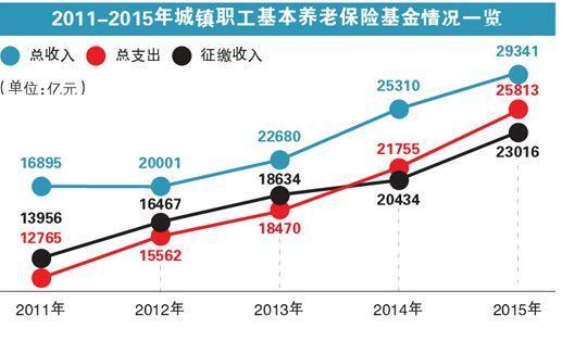 《报告》公布数据显示,2007年末个人账户空账规模突破万亿规模,达到10957亿元,此后空账规模以年均18.55%的速度增长,到2014年末已达35973亿元。而这背后是我国愈发凸显的当期城镇职工基本养老保险当期收不抵支问题。《报告》统计称,自2009年以来,除了2011年一个年度全国基金总收入的增长率一直低于基金总支出的增长率外,到2014年,总支出的年度增长率比总收入的年度增长率已经高出6.19个百分点。2014年当年,基金总收入为25310亿元,其中征缴收入为20434亿元,基金总支出为21755亿元。如果只考虑征缴收入,则2014年当年全国性收支缺口已经达到1321亿元。具体到地方,我国已经有24个省级统筹单位当期收不抵支,最严重的辽宁省和黑龙江省缺口规模都超过400亿元。